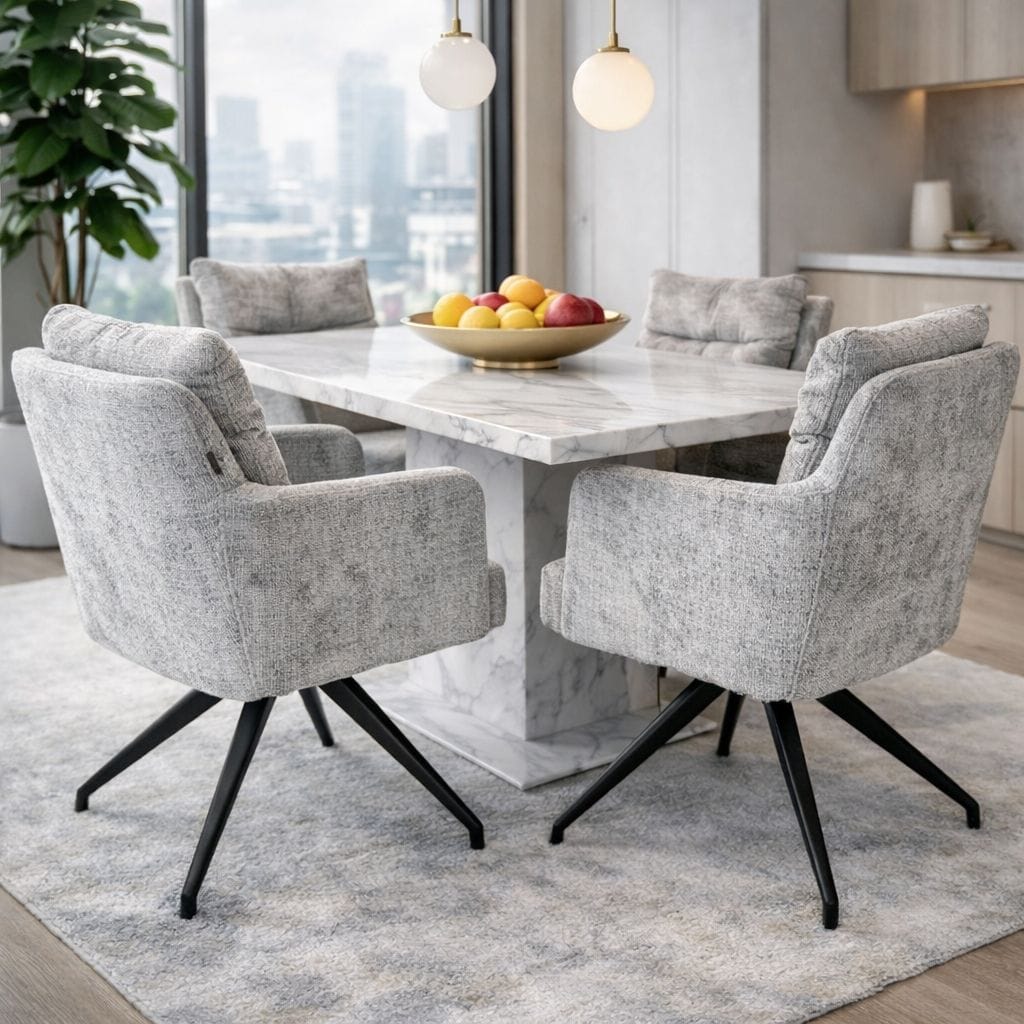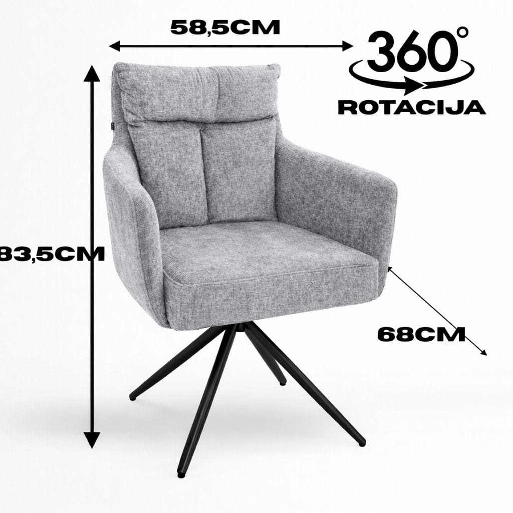 Fotelja Nora predstavlja savršen spoj stila, udobnosti i praktičnosti. Sa svojom rotacijom od 360°, idealna je za moderne trpezarije, čekaonice salona, kancelarije ili ugostiteljske prostore poput kafića i lounge zona.