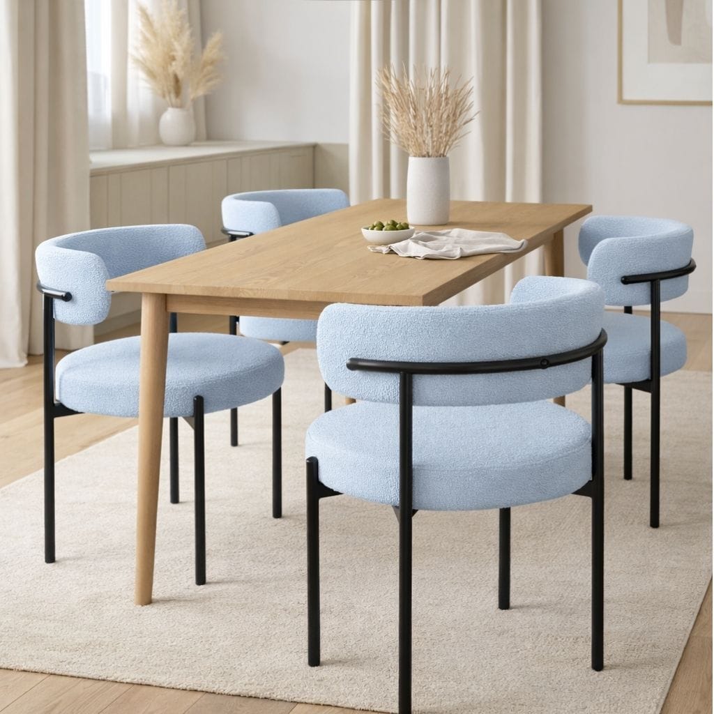 Stolica Cloud u elegantnoj ice plavoj boji predstavlja savršen spoj modernog dizajna, udobnosti i kvaliteta. Zahvaljujući svom minimalističkom izgledu i mekanom bouclé štofu, ova stolica se lako uklapa u savremene trpezarije, dnevne boravke, ali i u poslovne prostore poput kancelarija, čekaonica i restorana.
